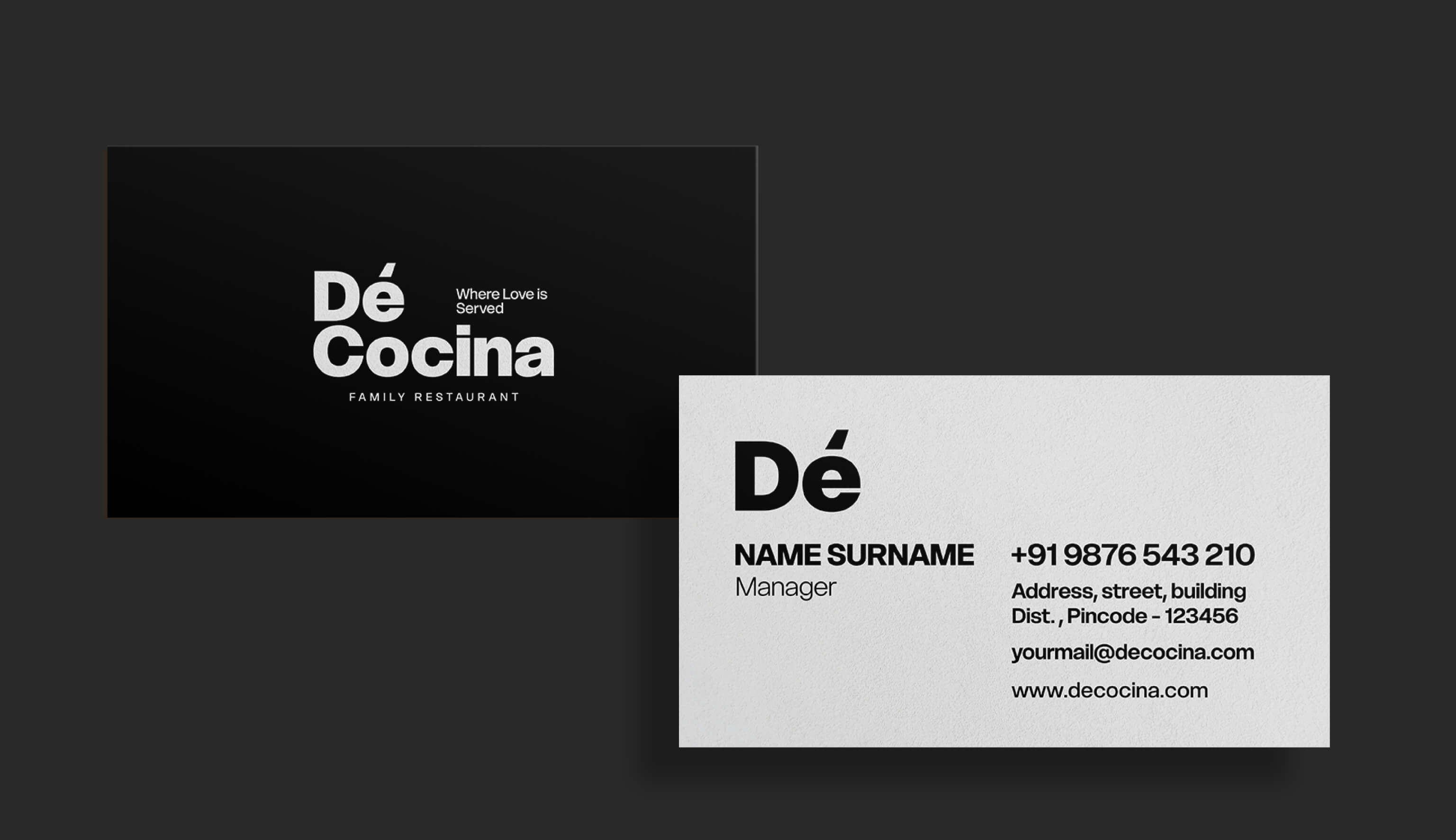 For DE COCINA Family Restaurant, Capt. Branding company built a brand identity that redefines simplicity through sophistication. Stepping away from the expected warmth of colour, we embraced a timeless black-and-white palette -symbolizing purity, class, and balance, allowing the details to speak louder than colours. From sleek typography to minimal line illustrations, every visual choice mirrors the restaurant’s vision - a place where authenticity meets artistry, and where every meal feels both comforting and elevated. Capt. Branding Company’s branding journey spanned across logo design, packaging, and visual identity. The clean contrasts and thoughtful composition give the brand, a premium yet welcoming personality -modern, memorable, and effortlessly stylish. By relying on design clarity instead of colour complexity, Capt. Branding Company created a brand experience that feels confident and distinct -one that proves that true flavour, much like true design, needs no embellishment to shine.
