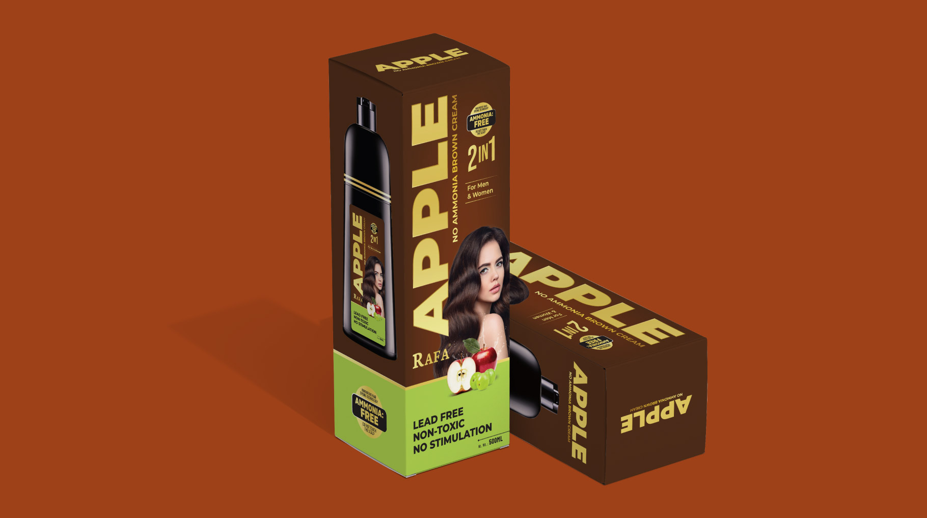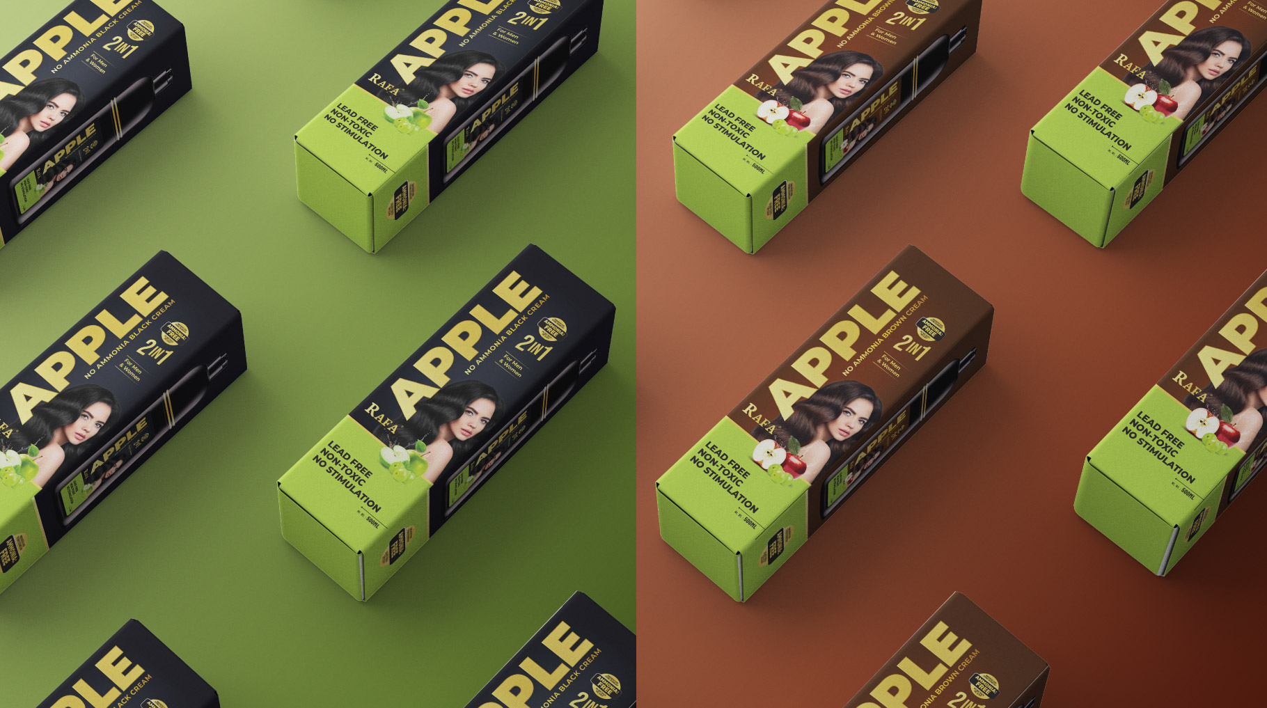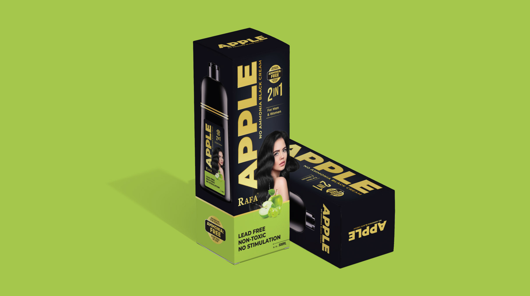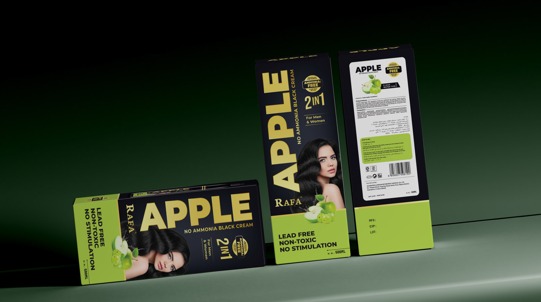 Indulge in the crunch of beauty with Rafa’s apple flavor 2 in 1 hair cream! Our vibrant packaging features a green apple design for black hair cream and a juicy red apple design for brown hair cream, making it a visually appealing treat for the eyes. The sleek and modern design ensures that the product stands out on shelves, while the apple theme adds a touch of fun and playfulness. A perfect blend of style and functionality!”