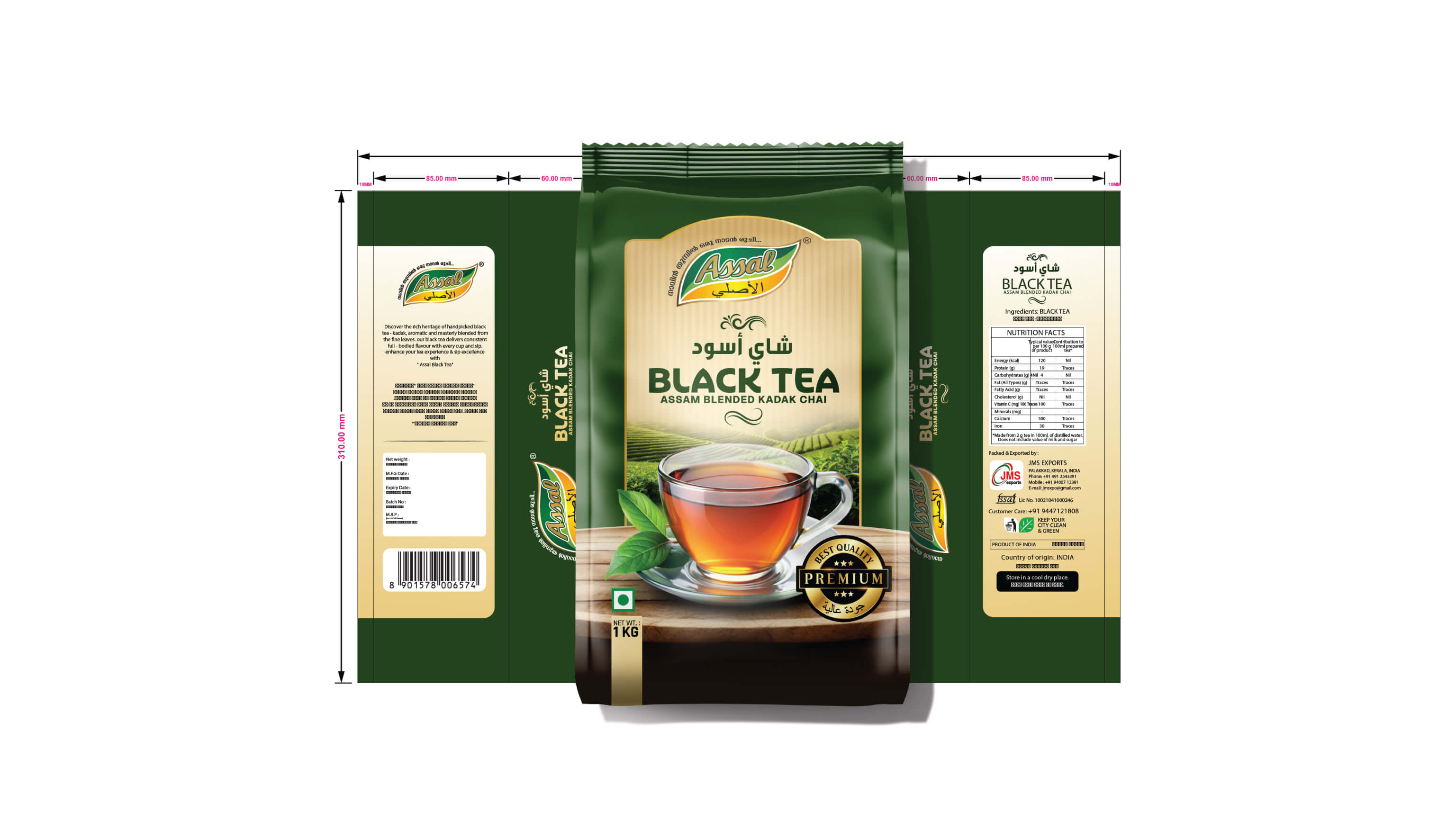 Capt. Branding Company plunged into the world of packaging design for ASSAL Black Tea - Assam Blended Kadak Chai, capturing the essence of freshness and quality that this brew embodies. Deep green tones intertwined with golden accents evoke the lush, vibrant tea gardens of Assam, transporting you to the heart of India's tea country. The front panel boasts a striking visual of a glass filled with rich black tea, inviting every chai lover to take a sip. Capt. Branding Company brought to life the Kadak Chai experience, through visuals that speak, and the bold typography ensures that the product grabs instant attention on the shelf, making it a compelling choice for those seeking a robust chai experience.