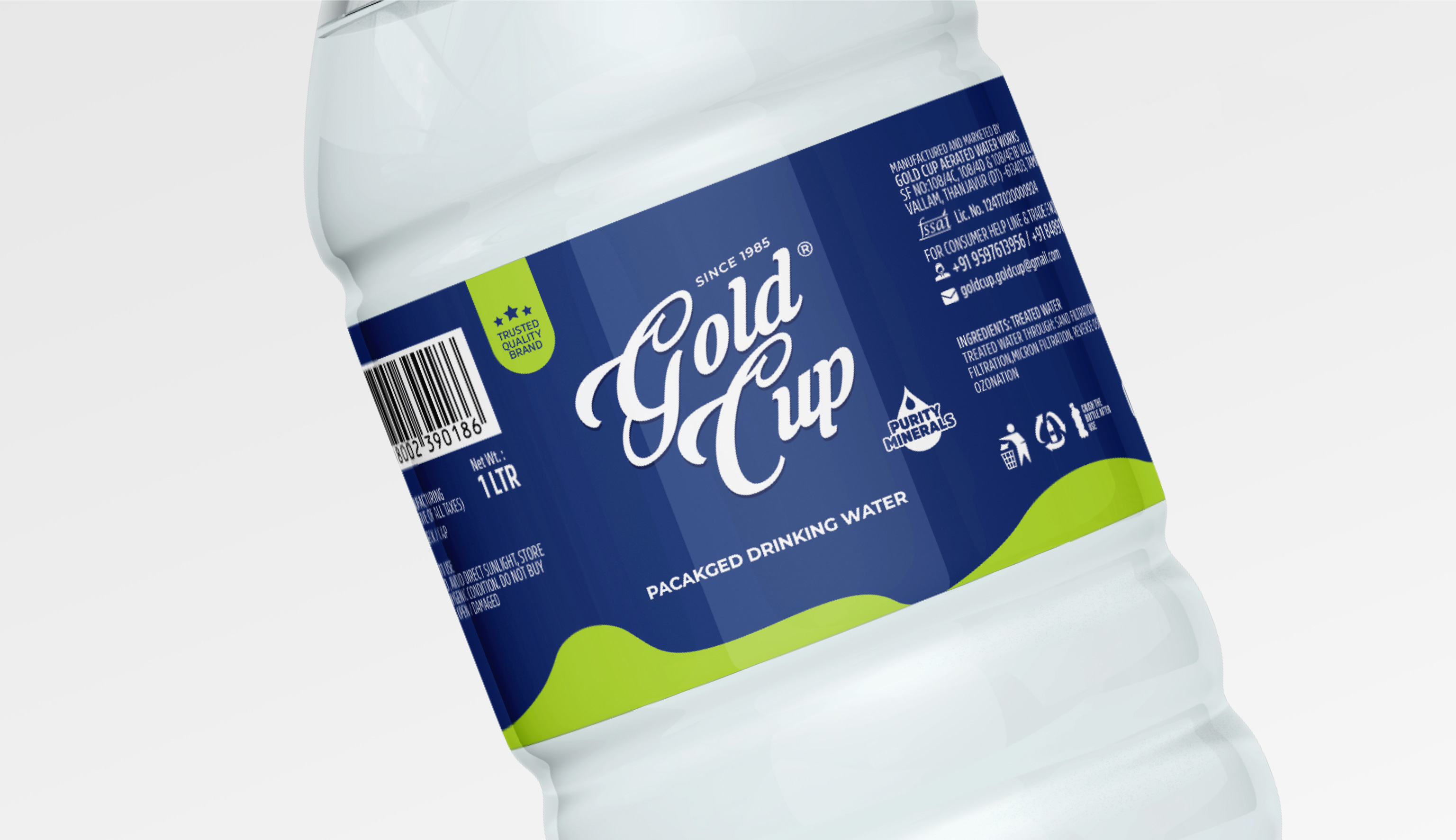 Capt. Branding Company curated a premium packaging design for GOLD CUP Drinking Water, blending sophistication with functionality. The design features transparent bottles with a fresh and eye-catching visual appeal. Royal blue accents on the labels and caps add a touch of elegance to the packaging.