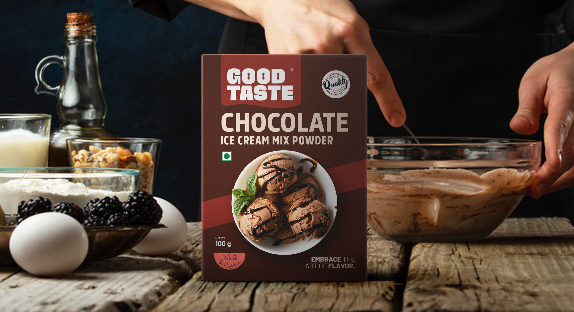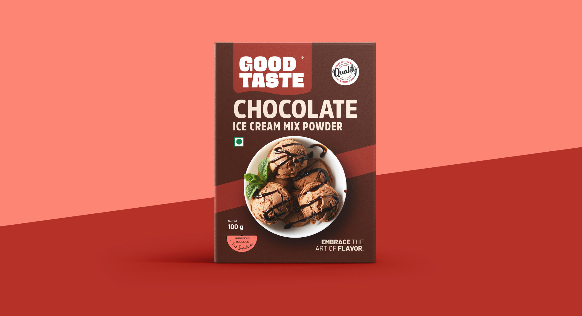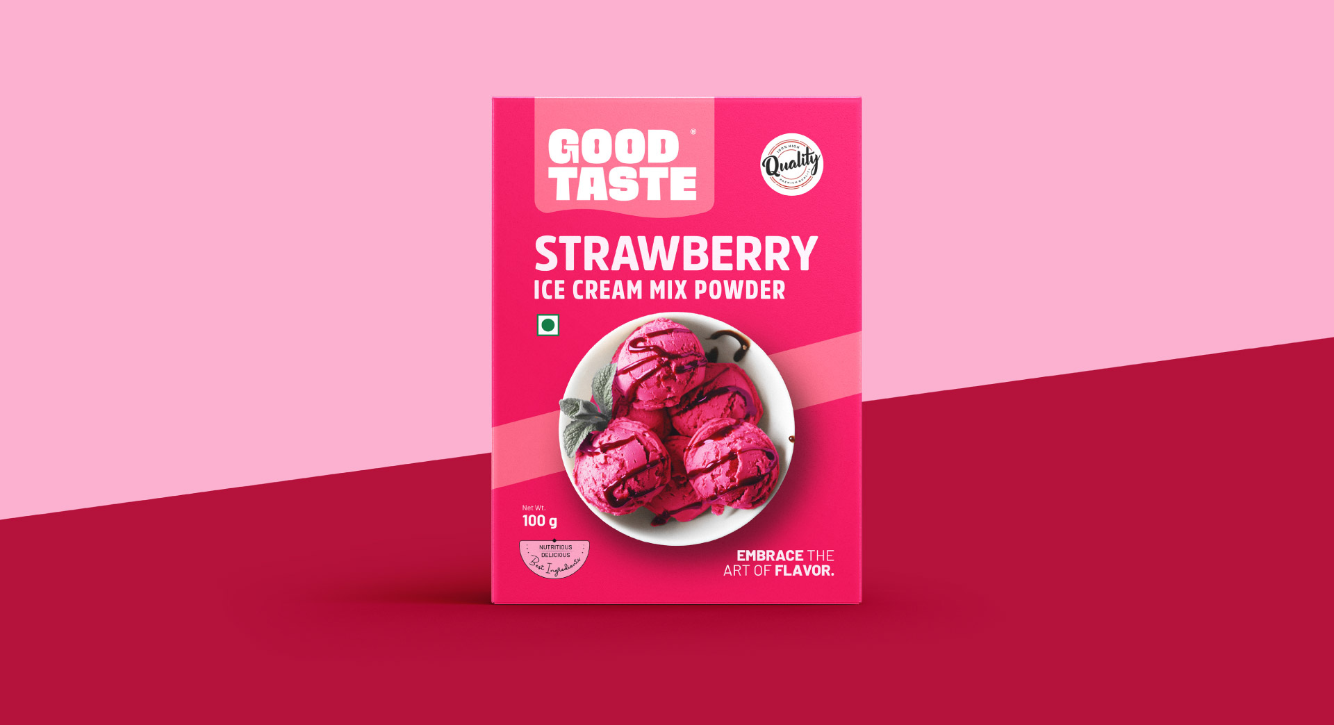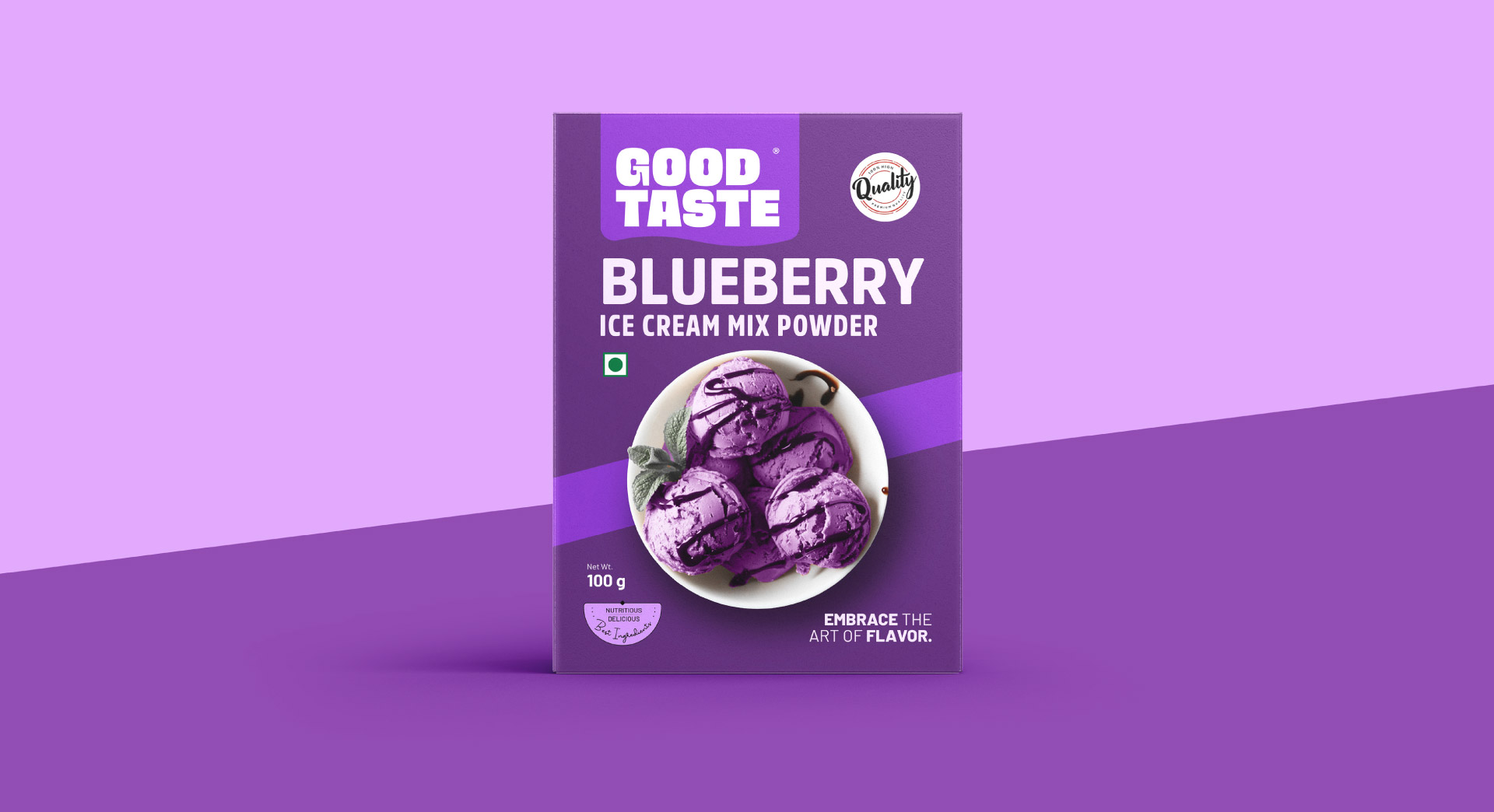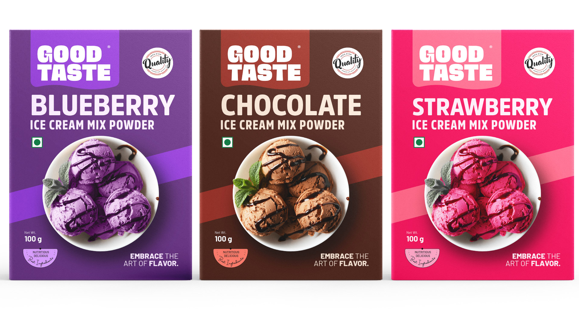 Capt. Branding Company expertly designed packaging for Good Taste Ice Cream Powder Mix, blending vibrant colors and enticing visuals. Each flavor—Chocolate, Strawberry, and Blueberry—boasts distinct hues, while clear product information and ingredients are prominently displayed. The compact, rectangular box ensures easy storage and visibility on store shelves