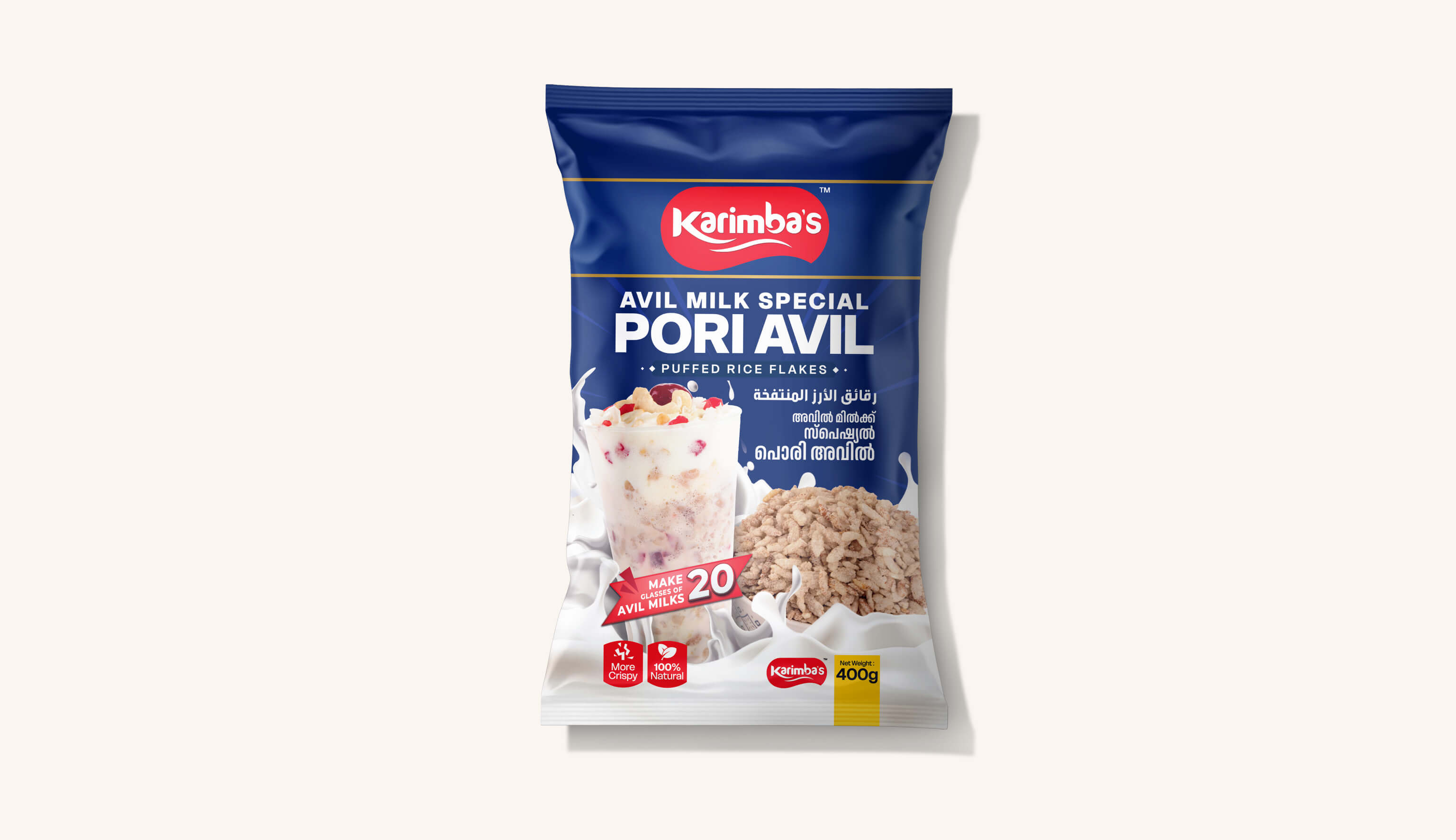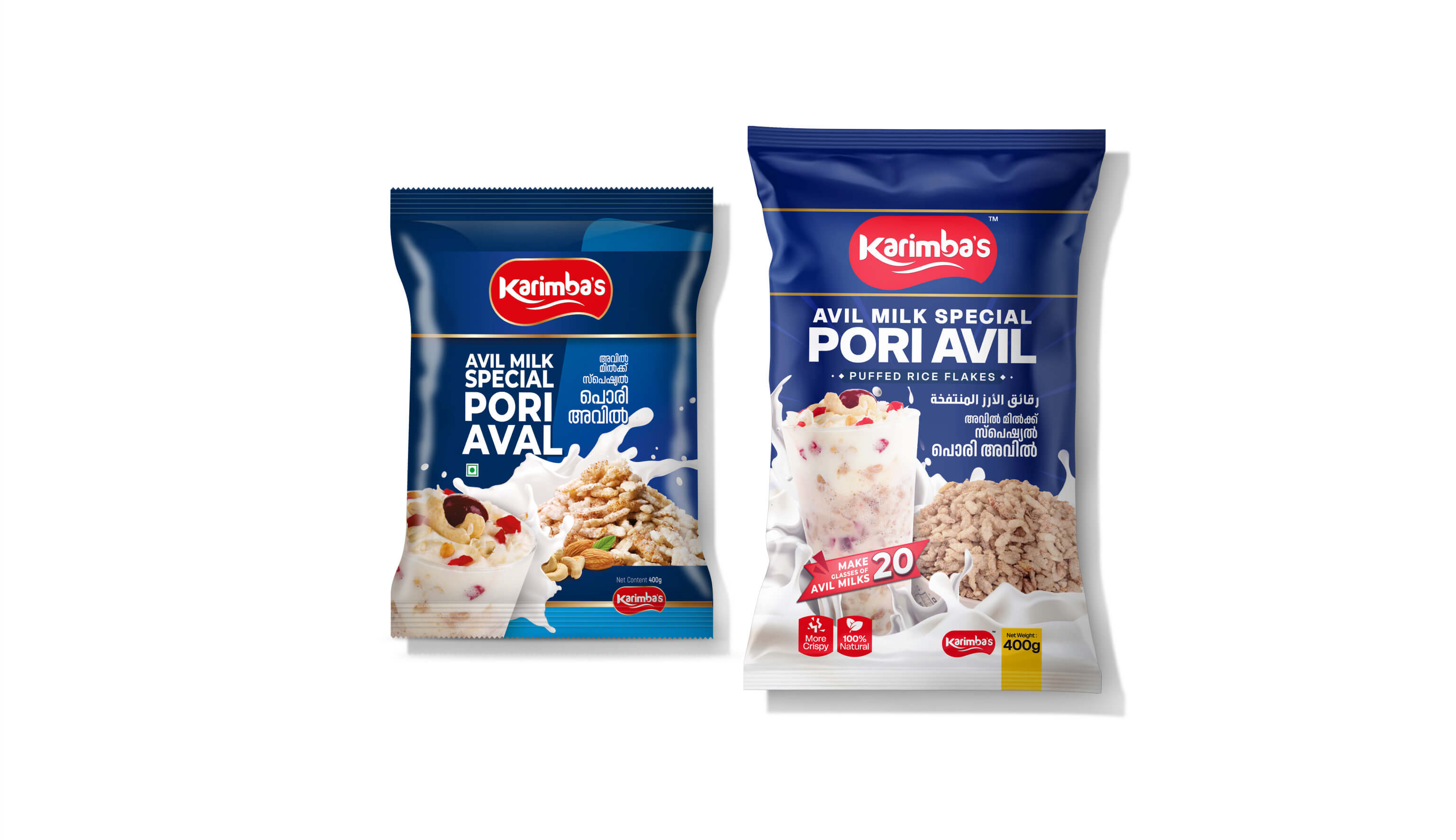 For KARIMBA'S Avil Milk Special Pori Avil, Capt. Branding Company led a design transformation that breathed new life into the packaging. The new pack flaunts a striking dark blue background that immediately grabs attention, with the brand logo popping in bold red. This dynamic duo sets the stage for a visual feast where delicious imagery of the product takes centre stage. Typography plays a crucial role here, making sure the product's story is told in a way that is both captivating and easy to grasp. In this design journey by Capt. Branding Company, every detail was geared towards connecting with the target audience. The visuals don't just show the product; they showcase its texture and purpose, making mouths water and curiosity peak.