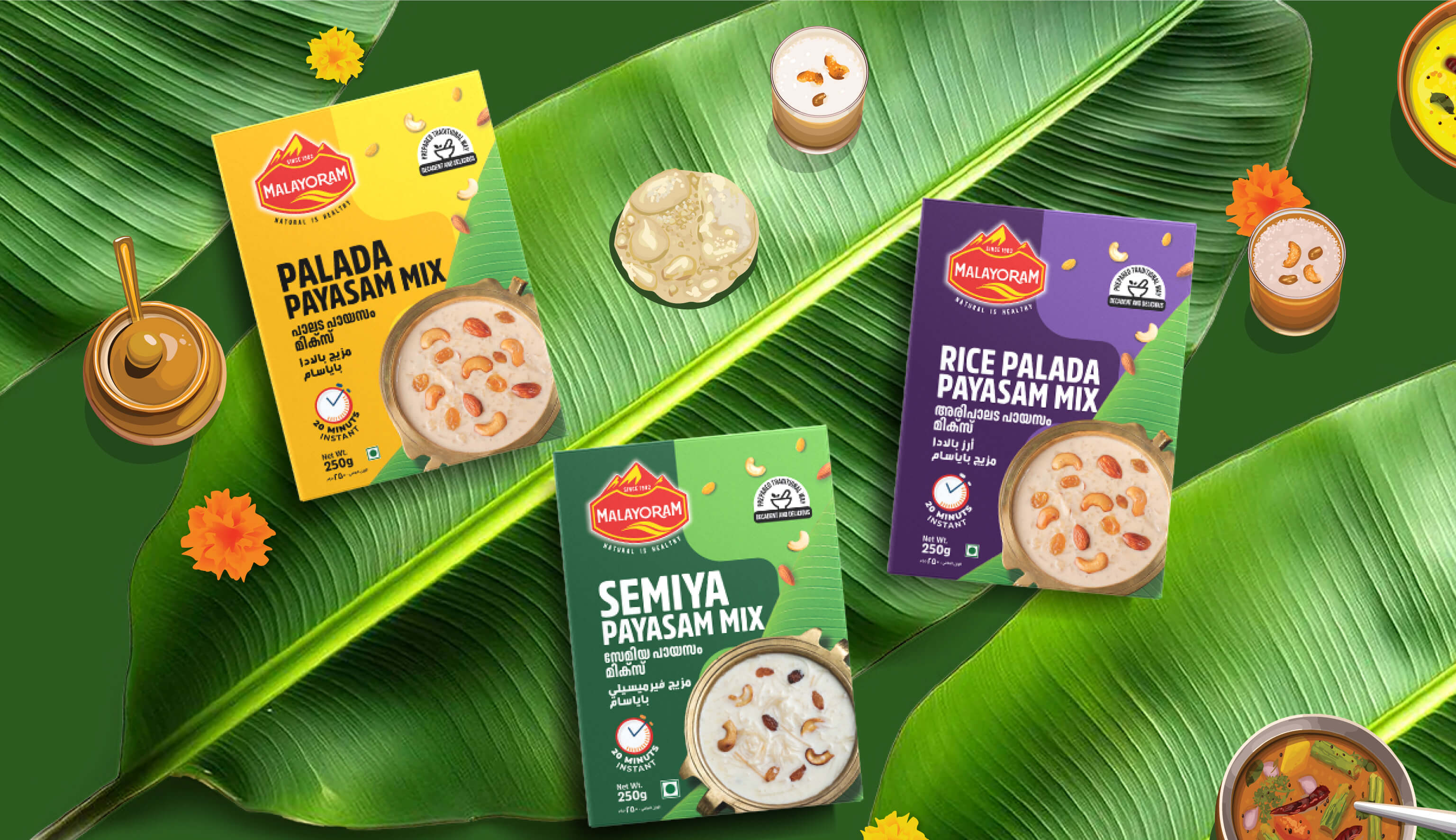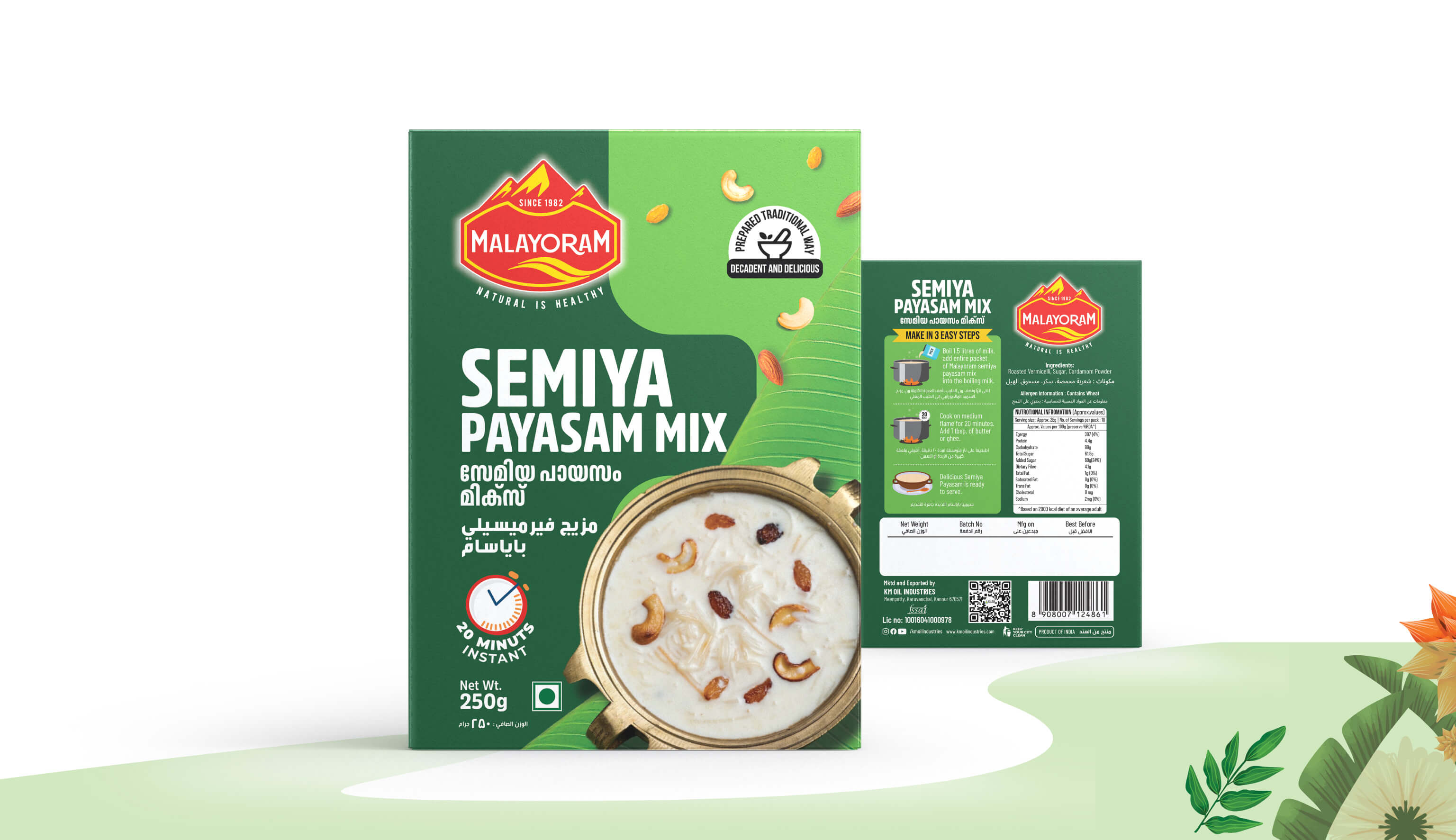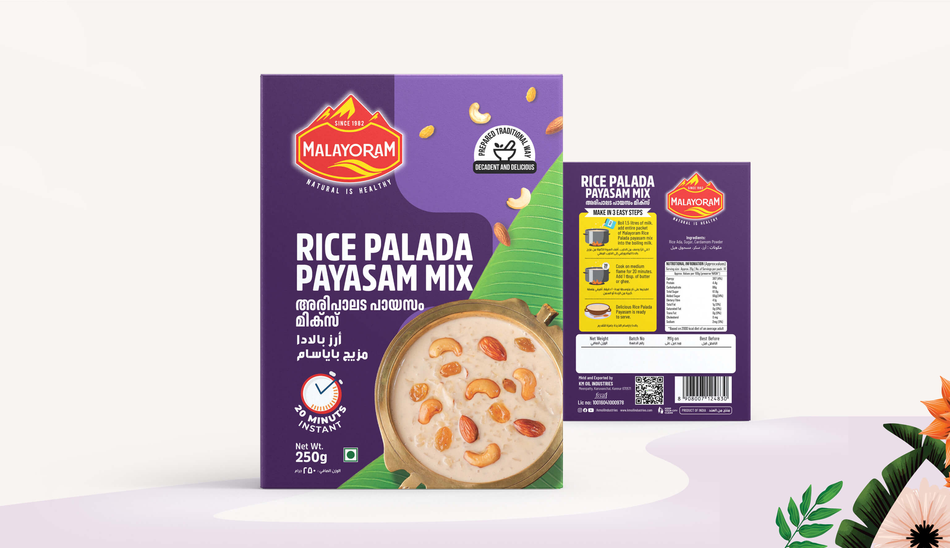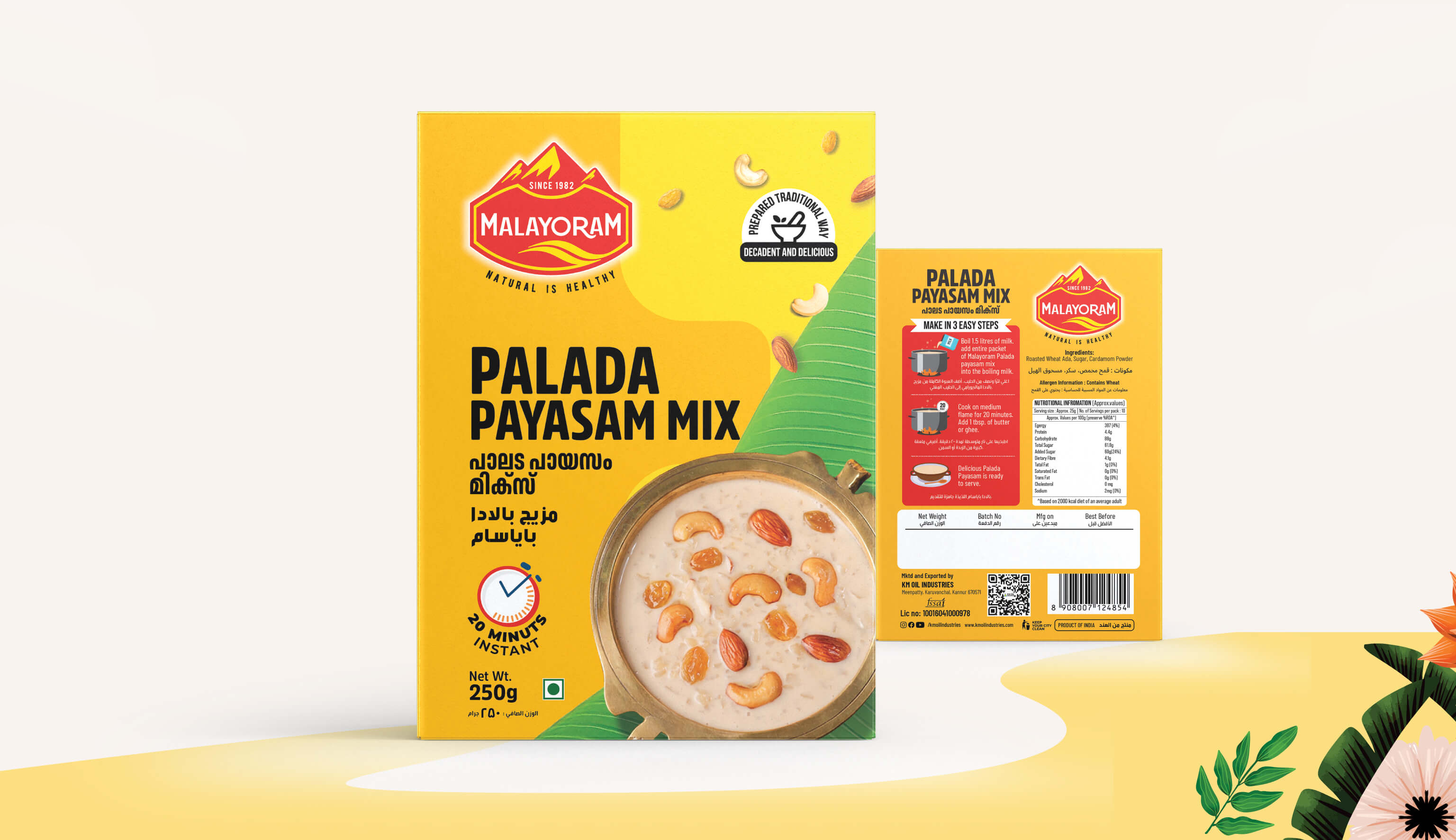 Capt. Branding Company wove a tale of tradition and taste with the packaging design for MALAYORAM's Payasam Mixes. We infused the designs with motifs and symbols that echo Kerala's authentic heritage. Vibrant, inviting colours dance across the packaging, creating a cohesive brand feel that beckons customers. The typography steps forward bold and clear, making sure the product name sings loud and proud - readable yet attractive, in a perfect harmony. In this design journey, Capt. Branding Company placed the client's satisfaction at the heart. We blended Kerala's essence with a modern touch, ensuring the products stand out in the marketplace. The design pulls in loyal customers with its nod to tradition, while also catching the eye of new ones looking for an authentic taste.