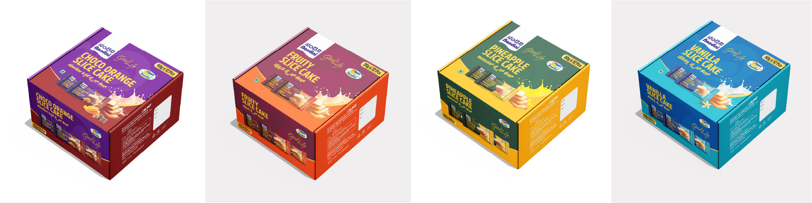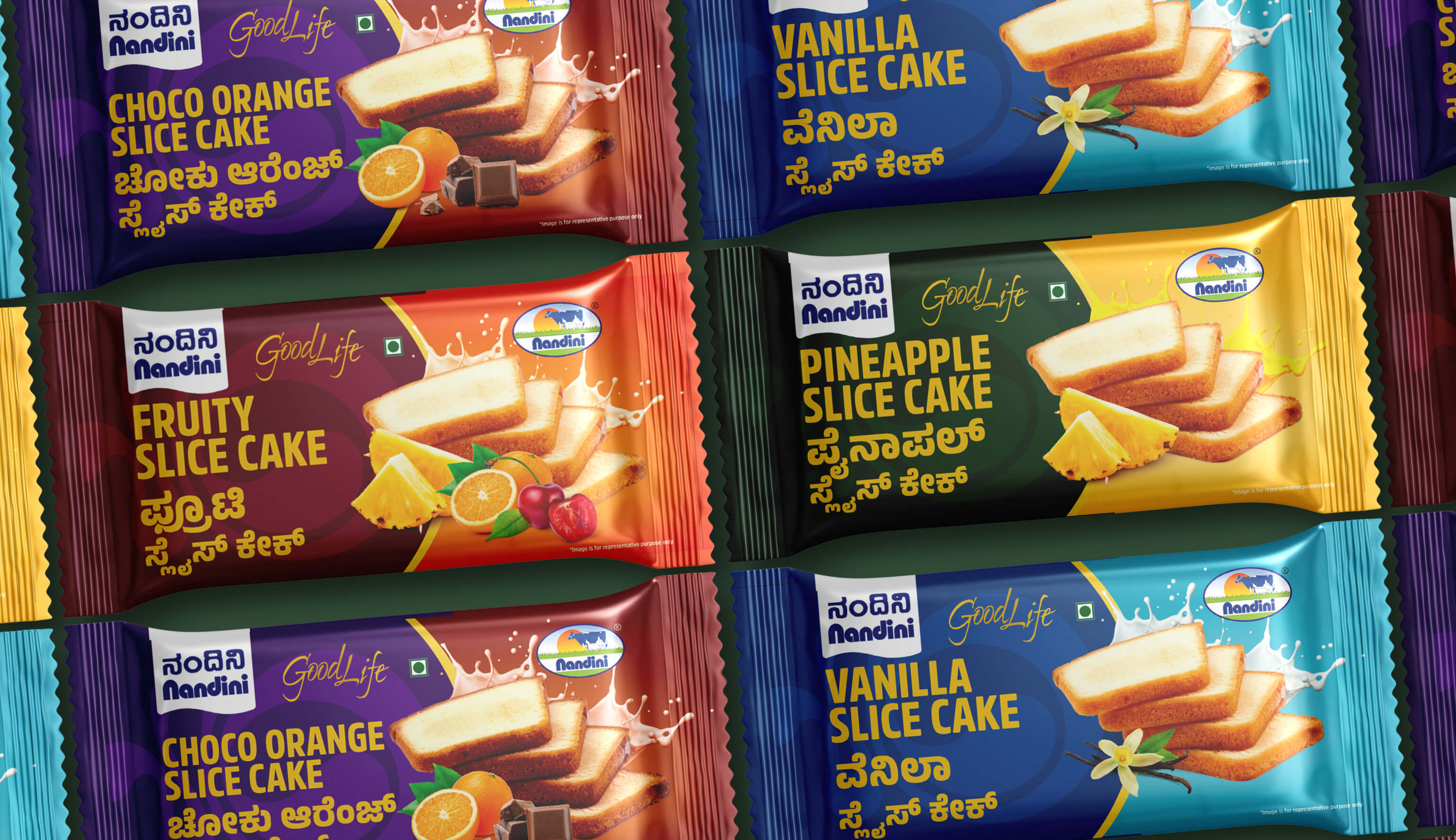 Capt. Branding Company undertook a captivating packaging design project for NANDINI (KMF)'s Good Life Slice Cakes range. The design beautifully showcases four distinct flavours - Vanilla Slice Cake, Pineapple Slice Cake, Fruity Slice Cake, and Choco Orange Slice Cake. Each flavour is represented by a unique colour palette that evokes the essence of the flavour: Pineapple in green and yellow, Fruity in maroon and orange, Vanilla in dark and light blue, and Choco Orange in purple and maroon. Capt. Branding Company ensured that the packaging is not just visually appealing, but also tells a story of deliciousness. Attractive pictures of the cakes highlight the flavours origins, and the logo is beautifully emphasized, making the product stand out. Our handpicked design anchored to elevate the brandโs legacy, enticing potential customers with notable details.