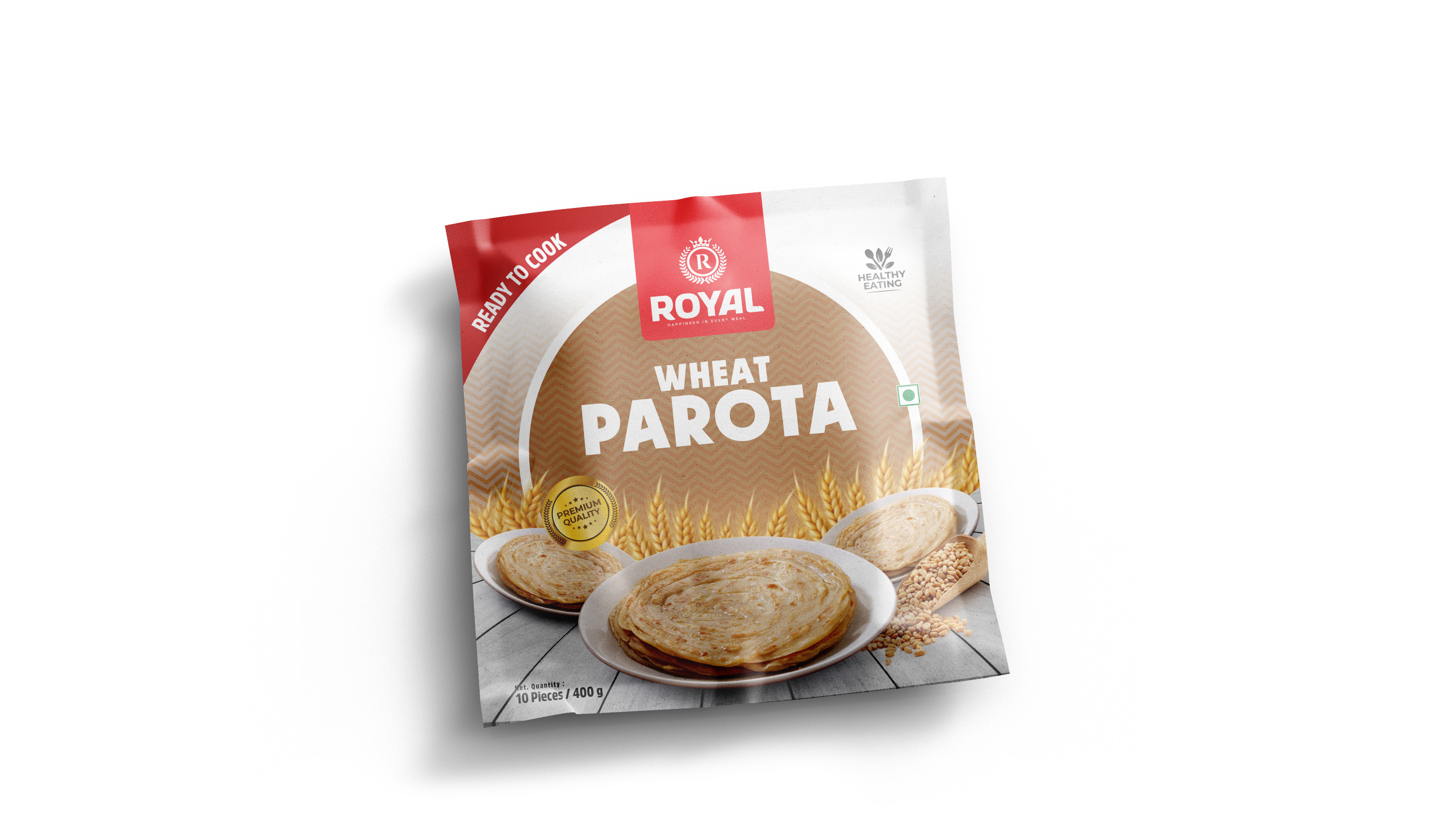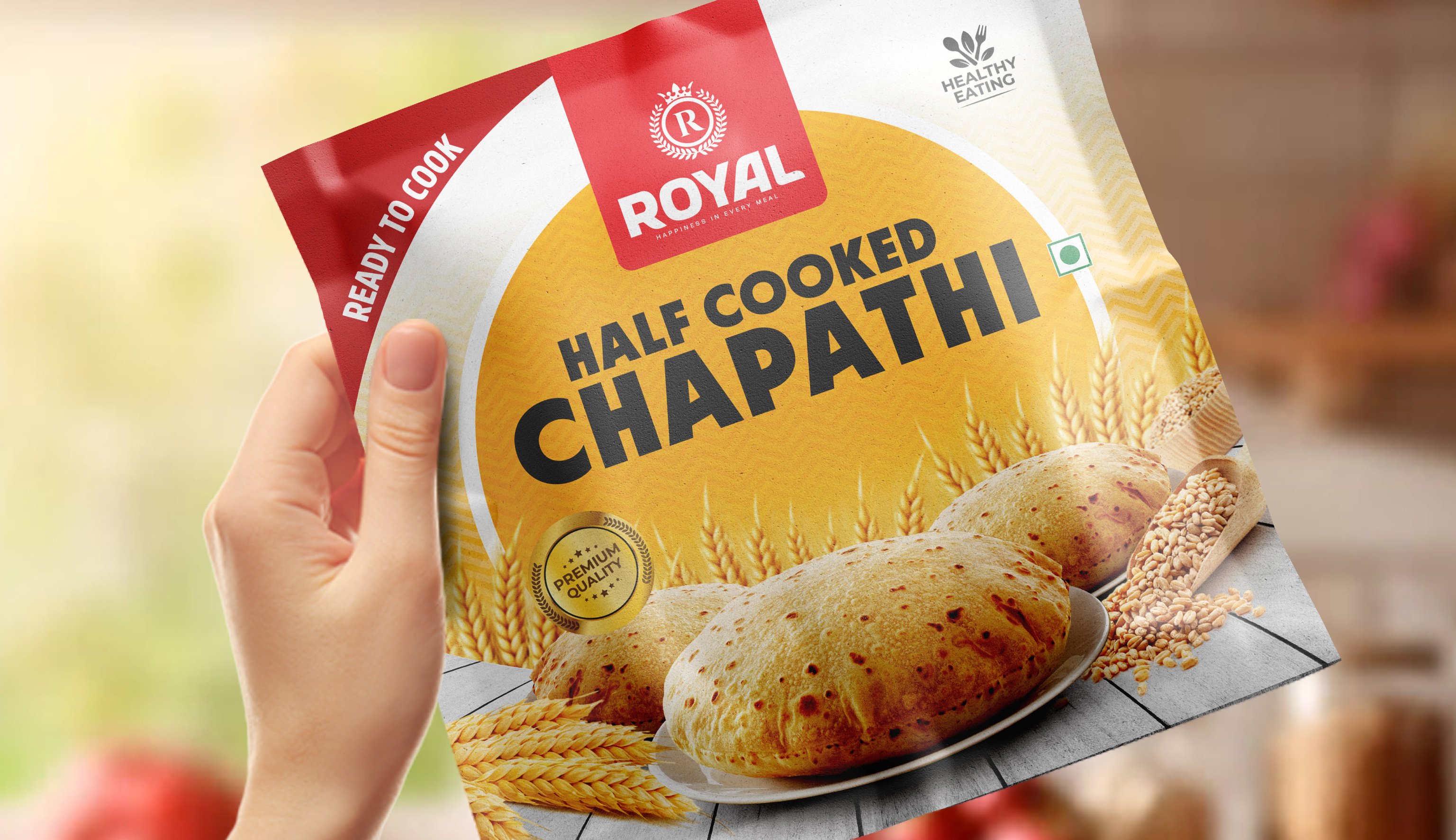 When it came to ROYAL’s Ready to Cook range, our goal was to bring authentic taste and visual richness to life-even before the first bite. Capt. Branding Company’s packaging proudly highlights the brand logo in white against a red backdrop-a mark of confidence, and heritage. Each variant carries its own identity: Malabar Parota-set in elegant white and green hues, complimented by real imagery that evokes the flaky, layered indulgence of Kerala’s beloved classic. Wheat Parota-wrapped in earthy brown and white tones, with subtle wheat illustrations in the background, celebrating its wholesome character. Half Cooked Chapathi-rendered in golden hue, evoking the promise of authentic experiences.Capt. Branding Company strategically designed to awake appetite and trust.