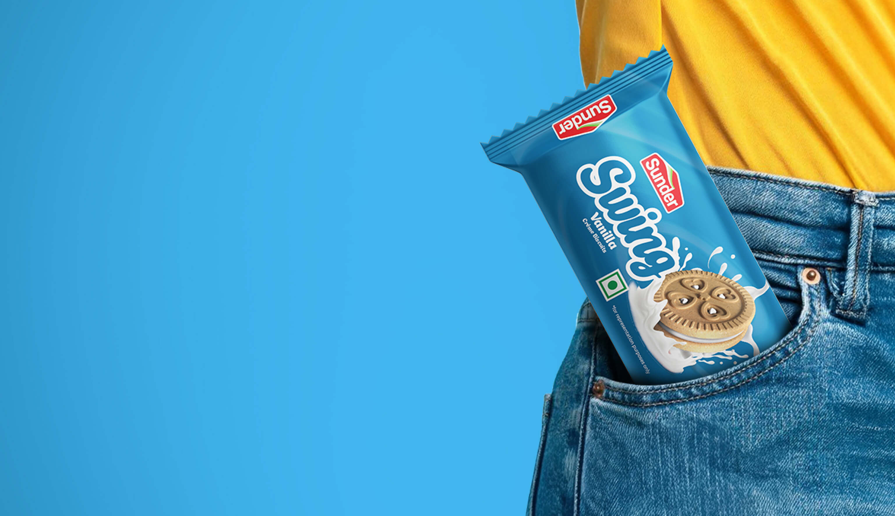 For SUNDER brand's Swing biscuits, Capt. Branding Company directed a packaging design that is boldly expressive. We played up the vibrant flavours of Vanilla, Strawberry, Orange, Elaichi and Chocolate through a flavour-coded colour palette - blue for Vanilla, pink for Strawberry, orange for Orange, green for Elaichi and brown for Chocolate. Bold typography screams 'Swing' on each pack, grabbing attention instantly. The design twirls around vibrant visuals and a yummy image of the biscuit, dipped in a splash of creamy delight. An eye-catching layout makes the whole package pop with a premium impact. At Capt. Branding Company, we successfully wove these elements together, to highlight the joy of the brand.