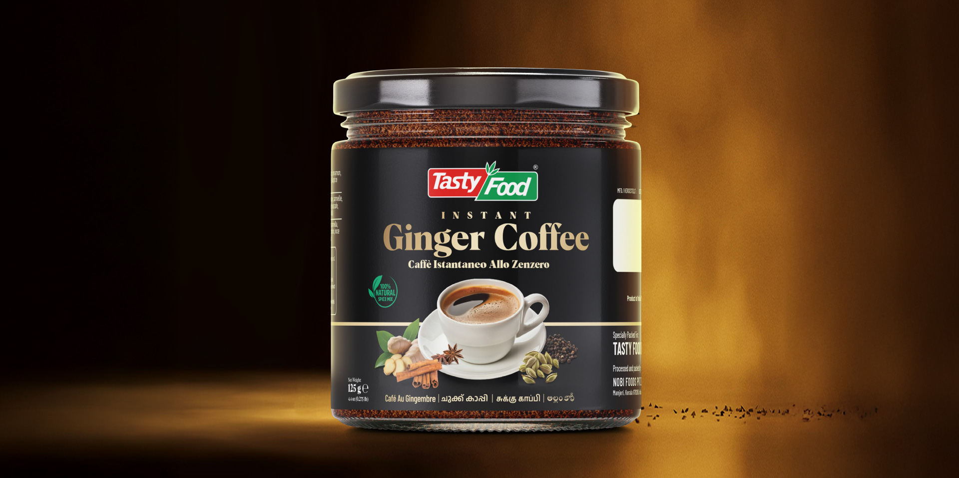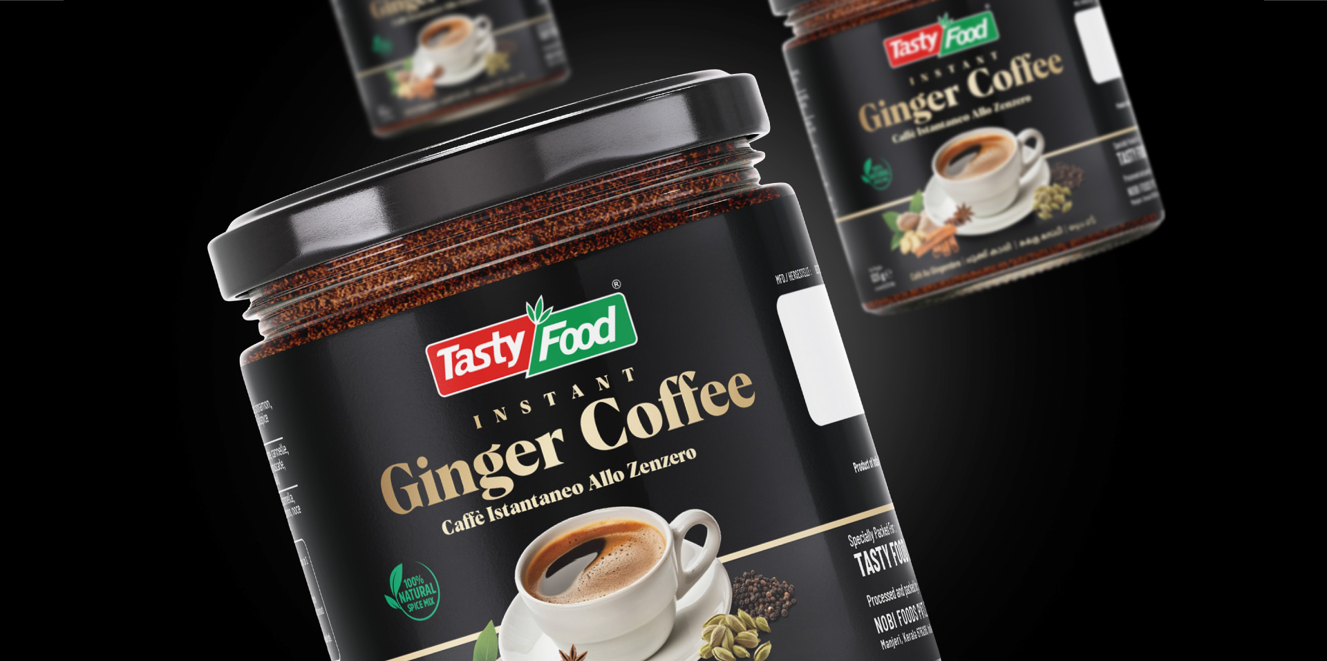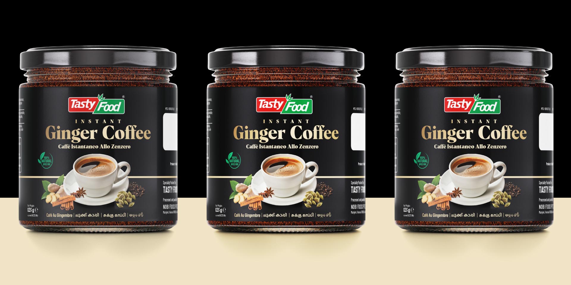 Capt. Branding Company, a visionary design studio, crafted Tasty Food’s Ginger Coffee packaging, blending elegance with sophistication. Their expert designers combined black backgrounds with golden typography, evoking warmth and luxury.