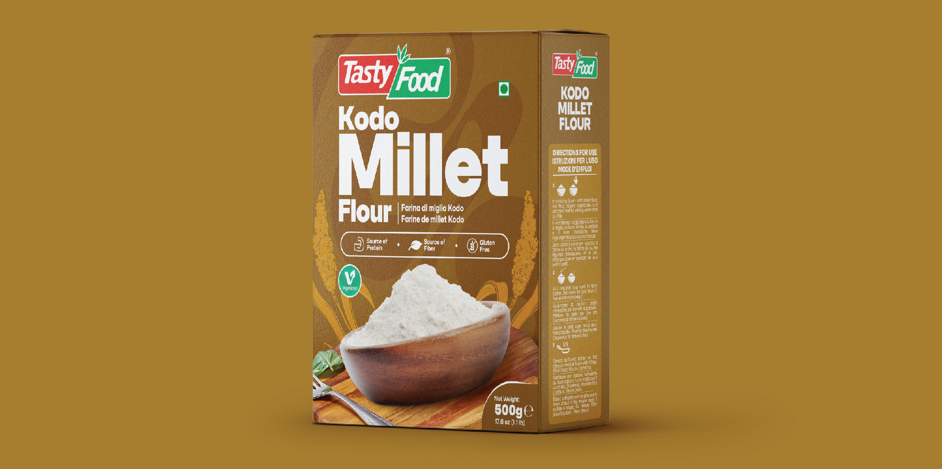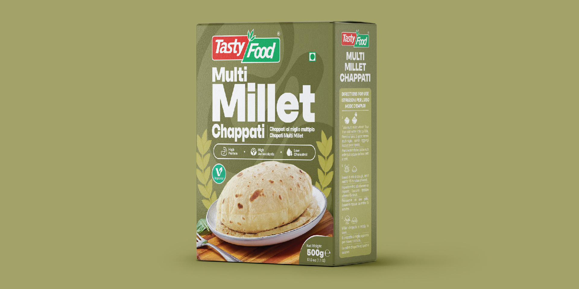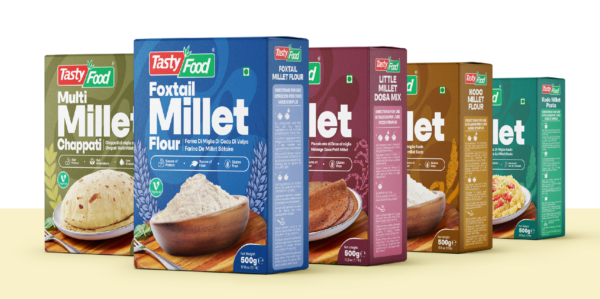 Tasty Foods’ millet product line boasts elegant packaging designed by Capt. Branding Company. The designs for Little Millet Dosa Mix, Kodo Millet Pasta, Foxtail Millet Flour, Kodo Millet Flour, and Multi Millet Chapati feature a harmonious blend of Western colors and typography, set against a delicate hand-drawn millet backdrop. This visually appealing design strikes a balance between modernity and earthiness, effectively communicating the products’ wholesome goodness and nutritional benefits. The clean white typography and minimalistic layout evoke a sense of simplicity and purity, resonating with health-conscious consumers seeking authentic millet-based solutions.