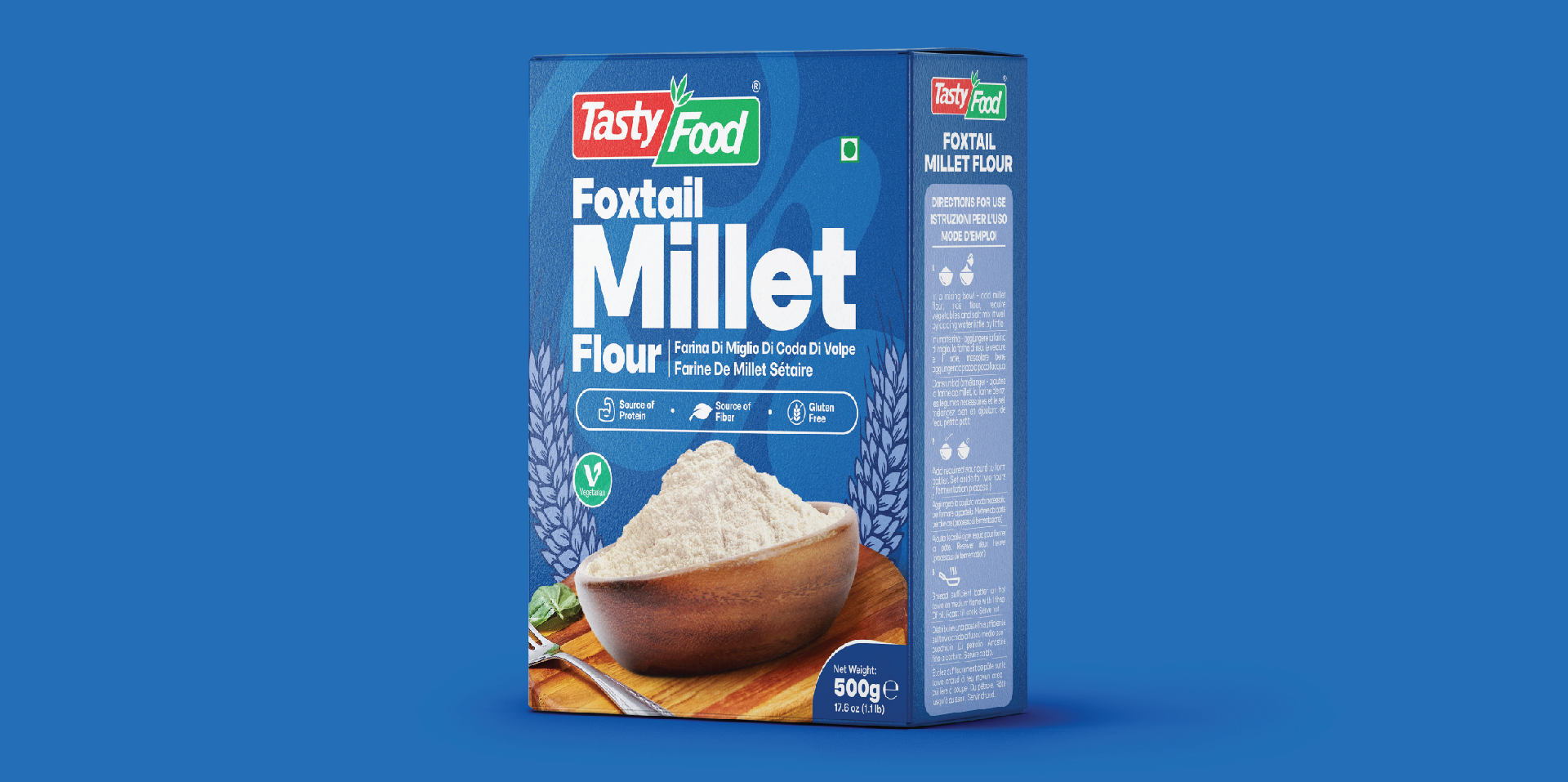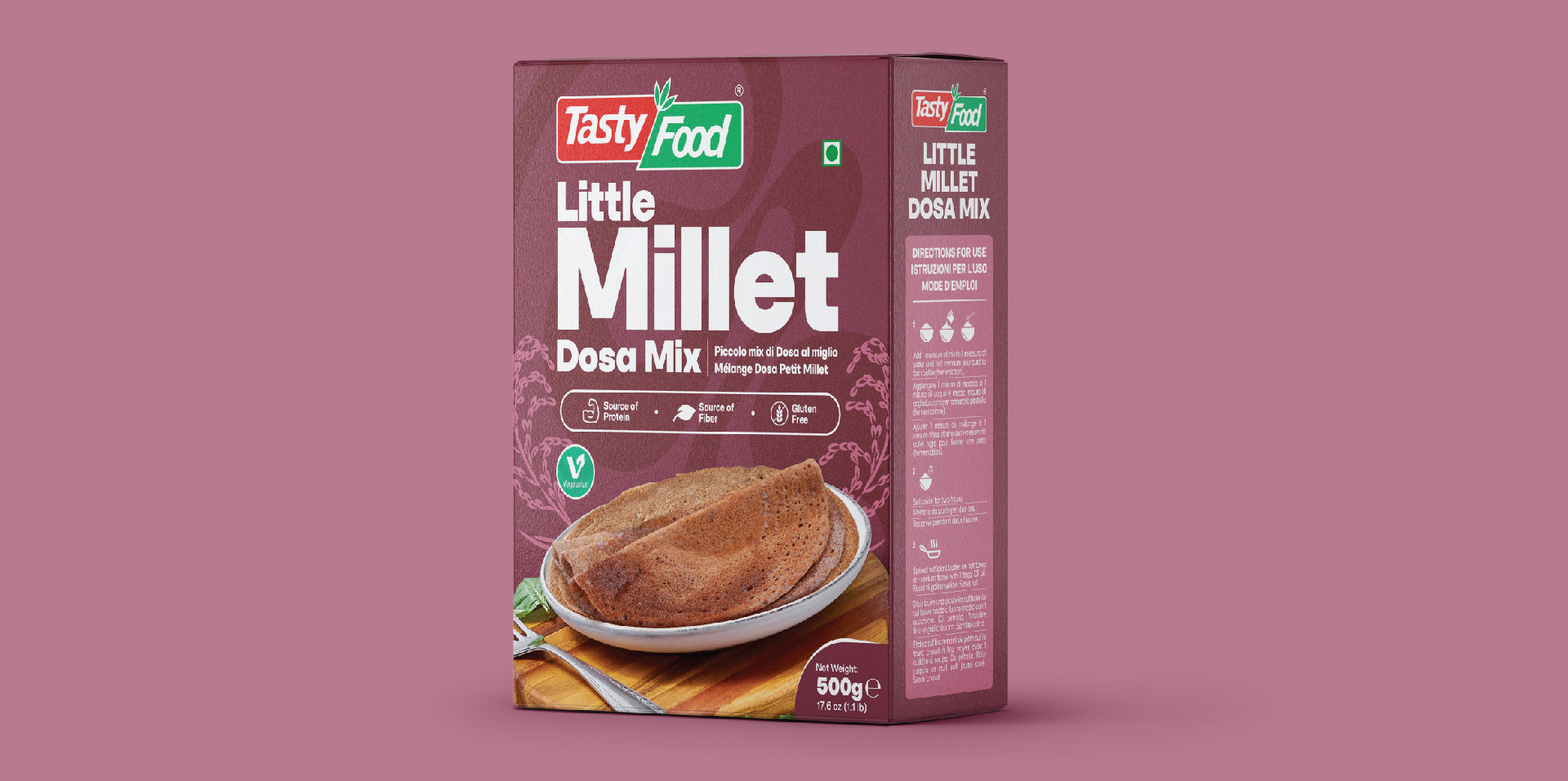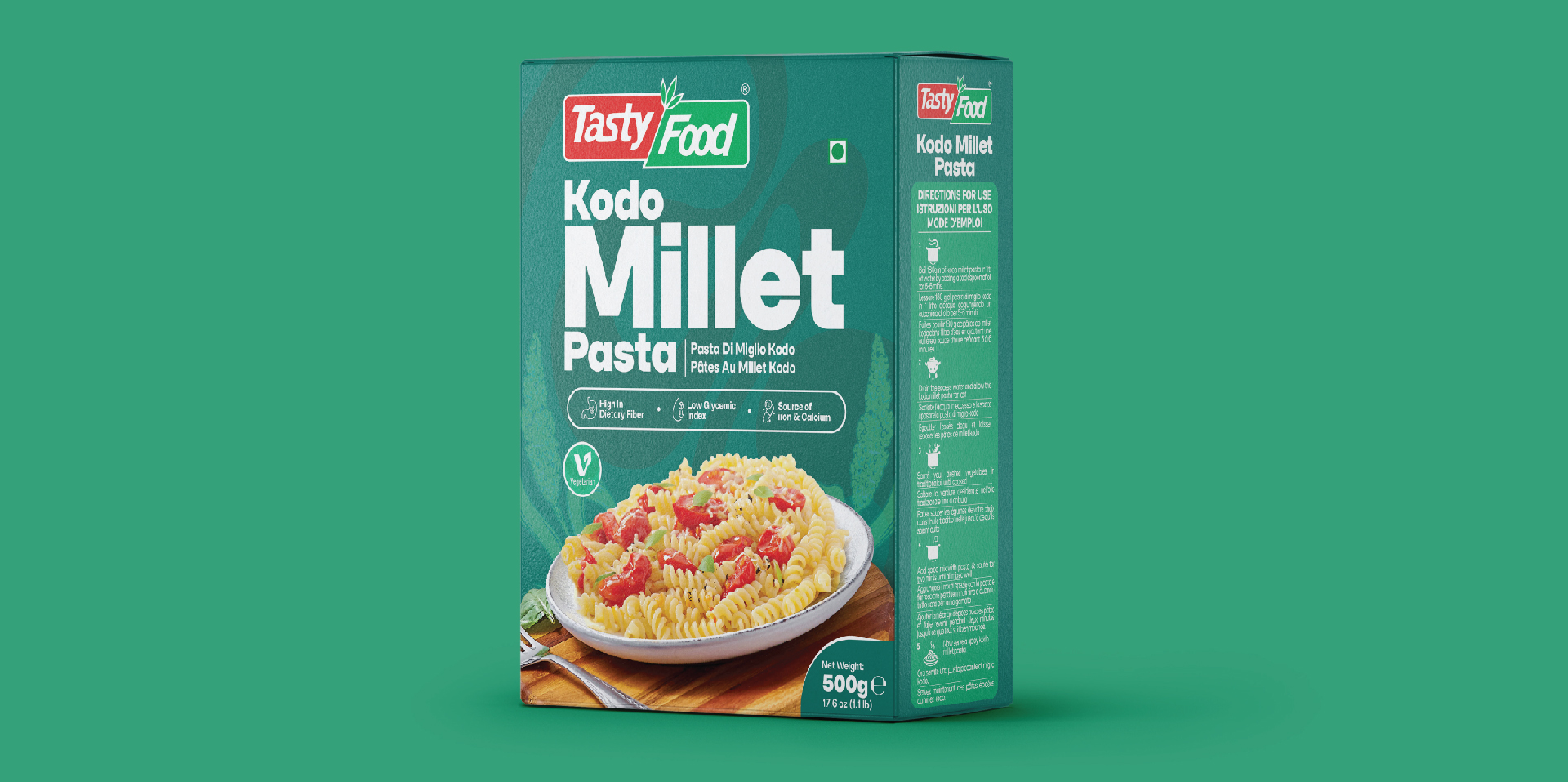 Tasty Foods’ millet product line boasts elegant packaging designed by Capt. Branding Company. The designs for Little Millet Dosa Mix, Kodo Millet Pasta, Foxtail Millet Flour, Kodo Millet Flour, and Multi Millet Chapati feature a harmonious blend of Western colors and typography, set against a delicate hand-drawn millet backdrop. This visually appealing design strikes a balance between modernity and earthiness, effectively communicating the products’ wholesome goodness and nutritional benefits. The clean white typography and minimalistic layout evoke a sense of simplicity and purity, resonating with health-conscious consumers seeking authentic millet-based solutions.