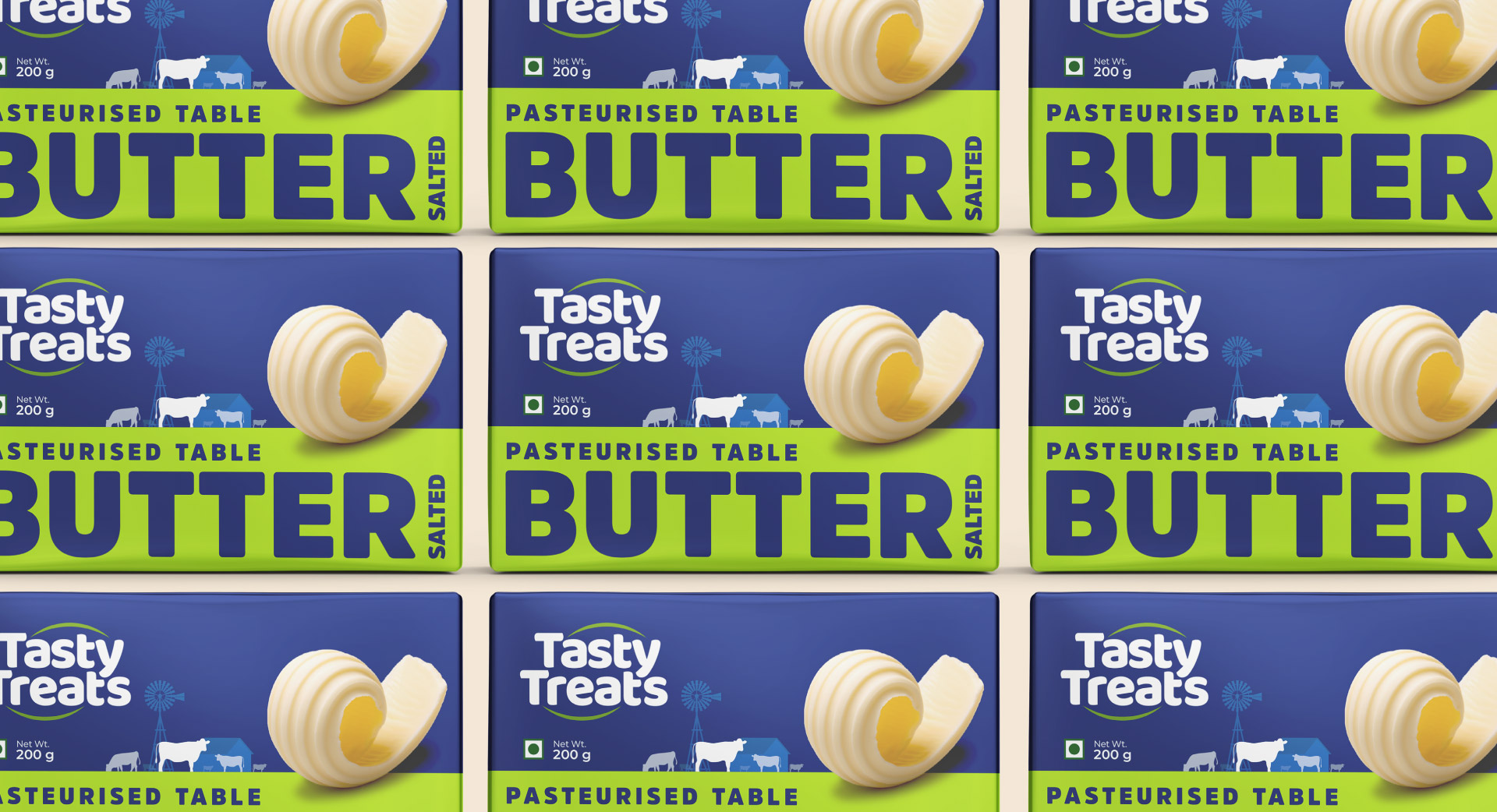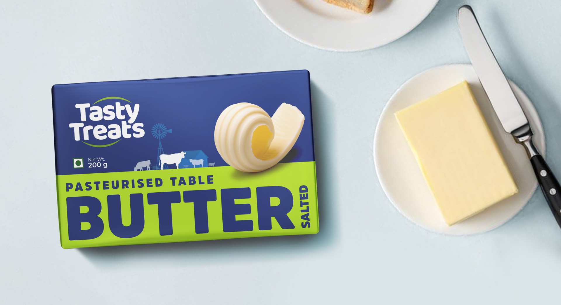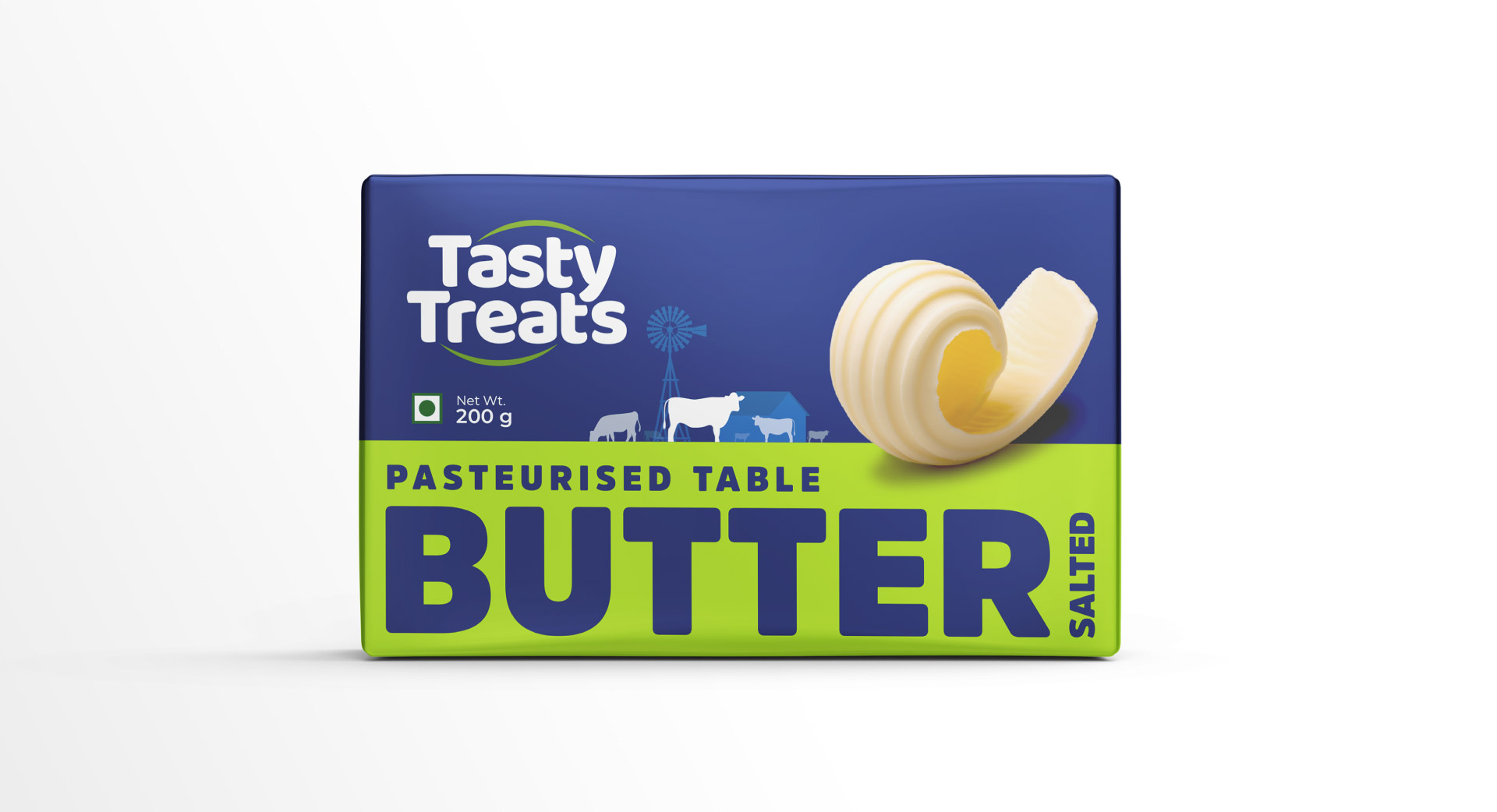 Presenting the scrummy yummy salted butter packaging from Tasty Treats, skilfully designed by Capt. The thawing font and the attention to colour coding aids consumers in quickly identifying these tiny Tasty Treats. Butter the loaves and better your eves!