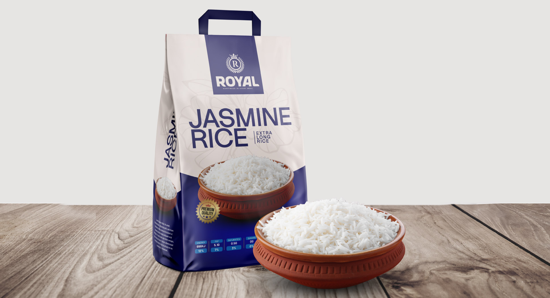 As you can see, we opted for elegant colours and added a lustre to them. Resembling to the coronation of a monarch, we have placed the logo on the centre top for both the Basmati and the Jasmine packages. The typo and the packaging are as long as the extra long rice inside.